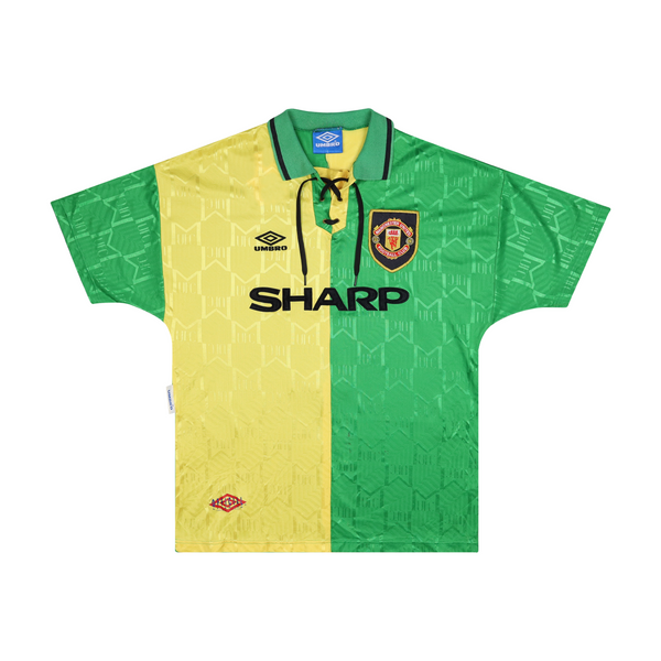 Worn as United won the inaugural Premier League title in 1992/93, ending their 26-year run without a league title. They ended up winning the title by a 10-point margin over their closest rivals. The arrival of Eric Cantona for a million pounds in late November helped boost United's title challenge and provided firepower for the years of dominance that followed.