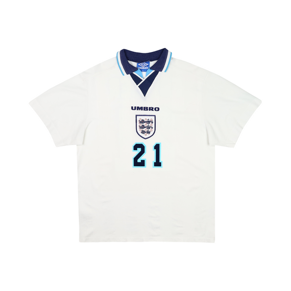 Worn during the Euro '96 tournament which was most notable for England's penalty shootout heartache in the semi final and Gareth Southgate's penalty miss. Alan Shearer won the tournaments Golden Boot with 5 goals and featured in the team of the tournament with 3 other England squad members.