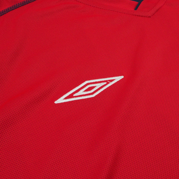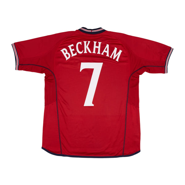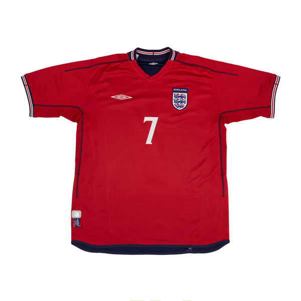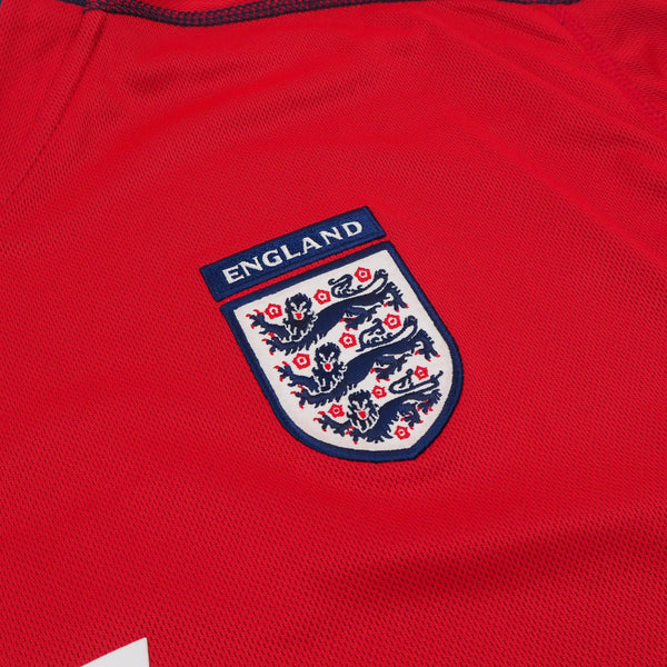 Worn at the 2002 World Cup where England exited the tournament at the quarter final stage. Beckham also scored arguably his most famous England goal in the shirt, an injury-time free-kick against Greece to equalize 2-2 and take the team top of their qualifying group on goal difference, confirming qualification to the tournament.
