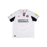 Unworn condition with original tags attached. Club crest is a heat applied embroidered patch. Club sponsor, manufacturer logo and player name/number are Polyflex, league sleeve patches are flock, all are heat applied. No pulls or bobbles. Colours and stitching in excellent condition.