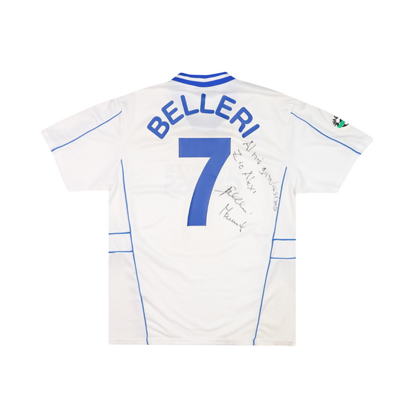 Excellent condition. Match issue version of shirt, issued to defender Manuel Belleri as part of the 2001-02 season. Club crest and manufacturer logo are flock and embossed. Player issue flock sleeve patches are heat applied and stitched. Club sponsor and rear name/number are PolyFlex and also heat applied. No pulls, few small bobbles to lower front. Signature applied to rear. Colours and stitching in excellent condition.