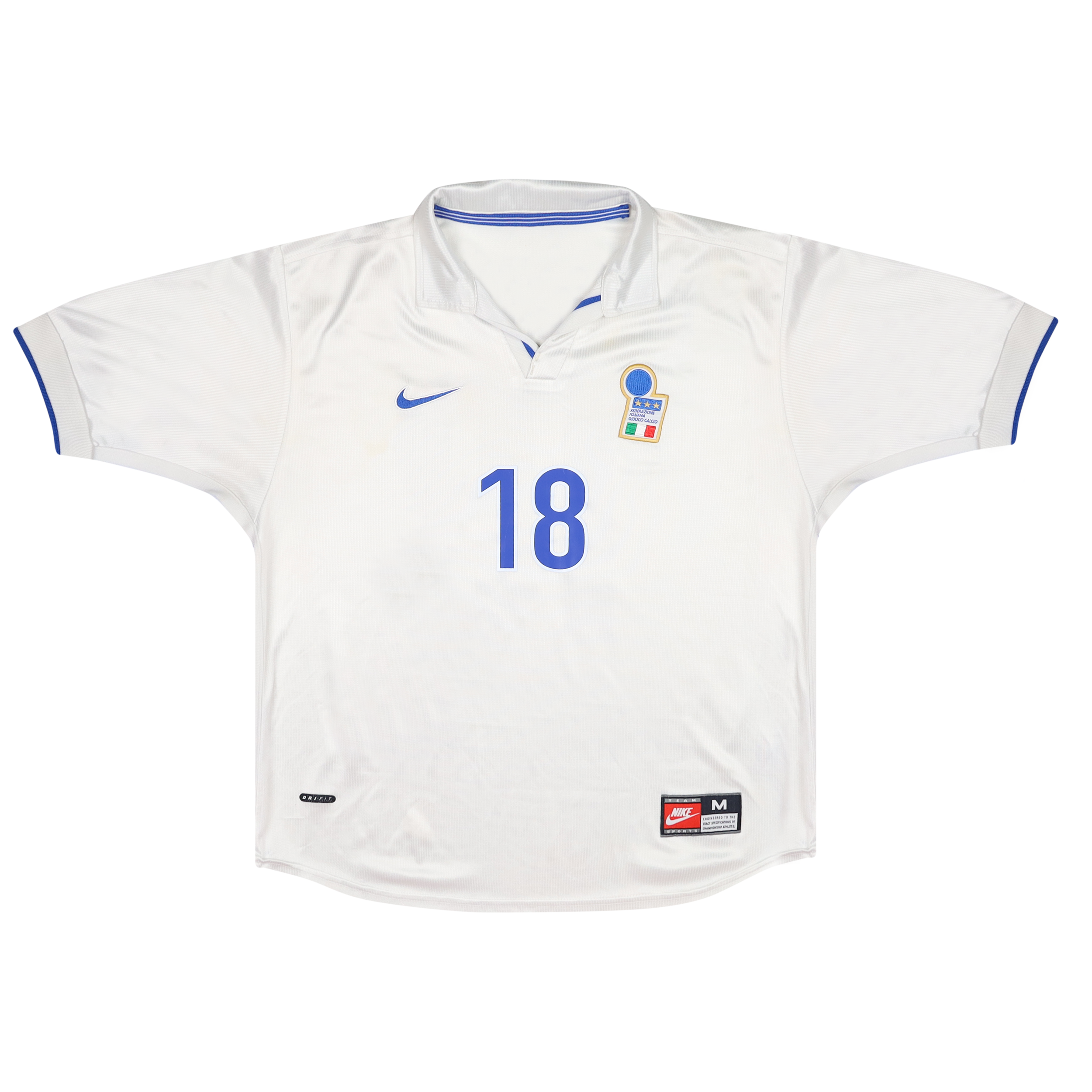 Mostly famously worn at the 1998 World Cup where the Nike Swoosh was not included in the design due to federation regulation. Italy were knocked out on penalties at the Quarter Final stage by the hosts and eventual winners.