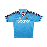 Worn across 2 seasons, this design saw City relegated in 1997/98 to see City playing in the third tier for the first time in their history in 1998/99. A frustrating first few months of the season mounted the pressure on manager Joe Royle, but the Maine Road board kept faith in him and rewarded by an upturn in form which saw them finish third in the final table and secure a play-off spot.