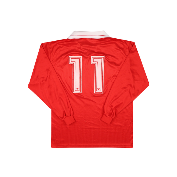 Match issue version of shirt, issued to the squad as part of the 1998-99 season. Club crests are embroidered patches, stitched onto shirt. Manufacturer logos and rear player number are flock and heat applied. Club sponsor patch is Polyflex and heat applied. No pulls, few small bobbles to lower front. Colours and stitching in excellent condition.